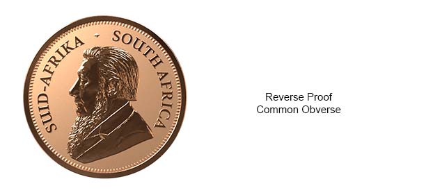 The surface finish on the Reverse Proof 1 oz gold Krugerrand shows the design of the coin as a polished finish against a frosted background, the reversal of the standard proof finish where the design is frosted against a mirror background.
