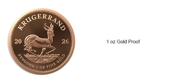 The 5-coin set consists of the ½ oz, ¼ oz, 1/10 oz, 1/20 oz and 1/50 oz proof Krugerrand coins.